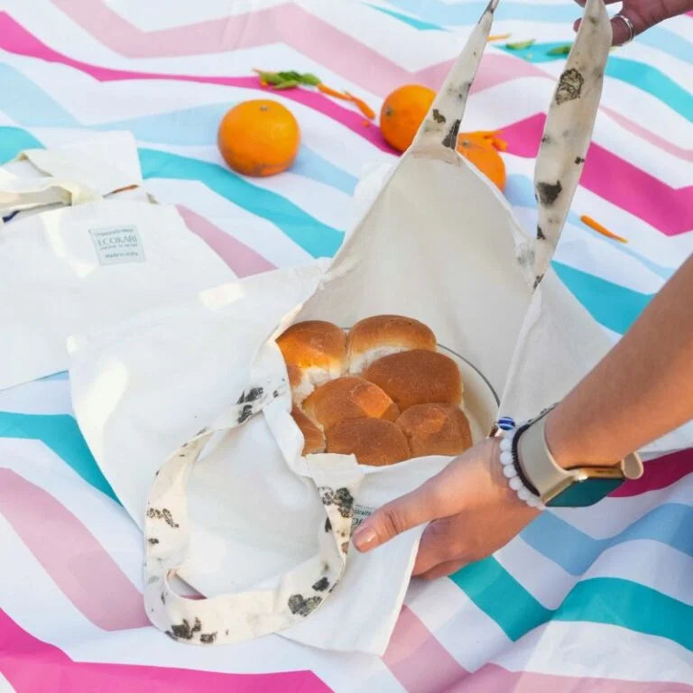 Add our Eco-Printed Carry on Picnic Bag, the perfect food carrier for your on-the-go lifestyle. Crafted with hemp viscose fabric and eco-printed handles, this bag combines fashion and sustainability. Its spacious design easily accommodates plates, casseroles, and more, making it ideal for picnics, potlucks, and family outings. With its durable construction and convenient carry handles, you can take it anywhere with ease. Say goodbye to flimsy disposable bags and embrace a greener way to transport your food. Upgrade to our eco-printed picnic bag today and make a difference while enjoying the convenience you deserve.