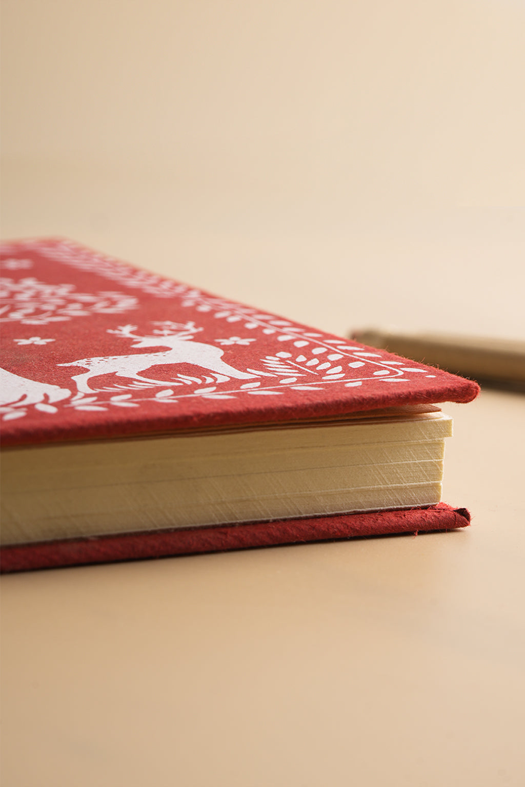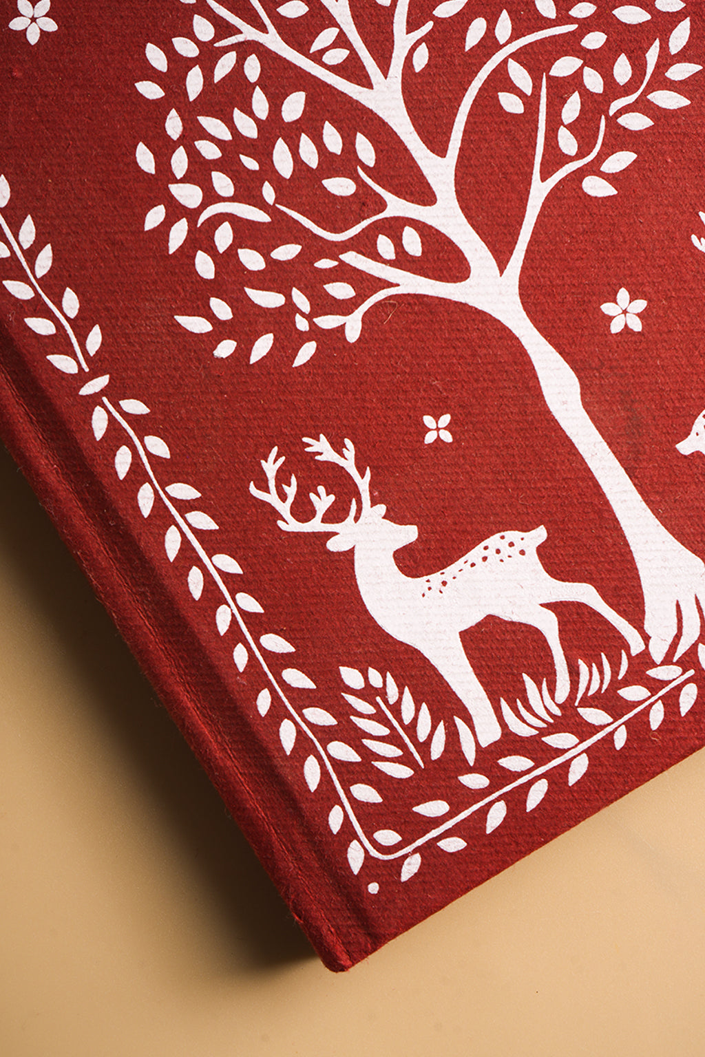 The cover features a hand-illustrated forest motif with deer and trees, symbolising harmony with nature. Set on a rich earthy red base, the design adds artisanal charm while the sturdy hardbound finish ensures durability for daily use.