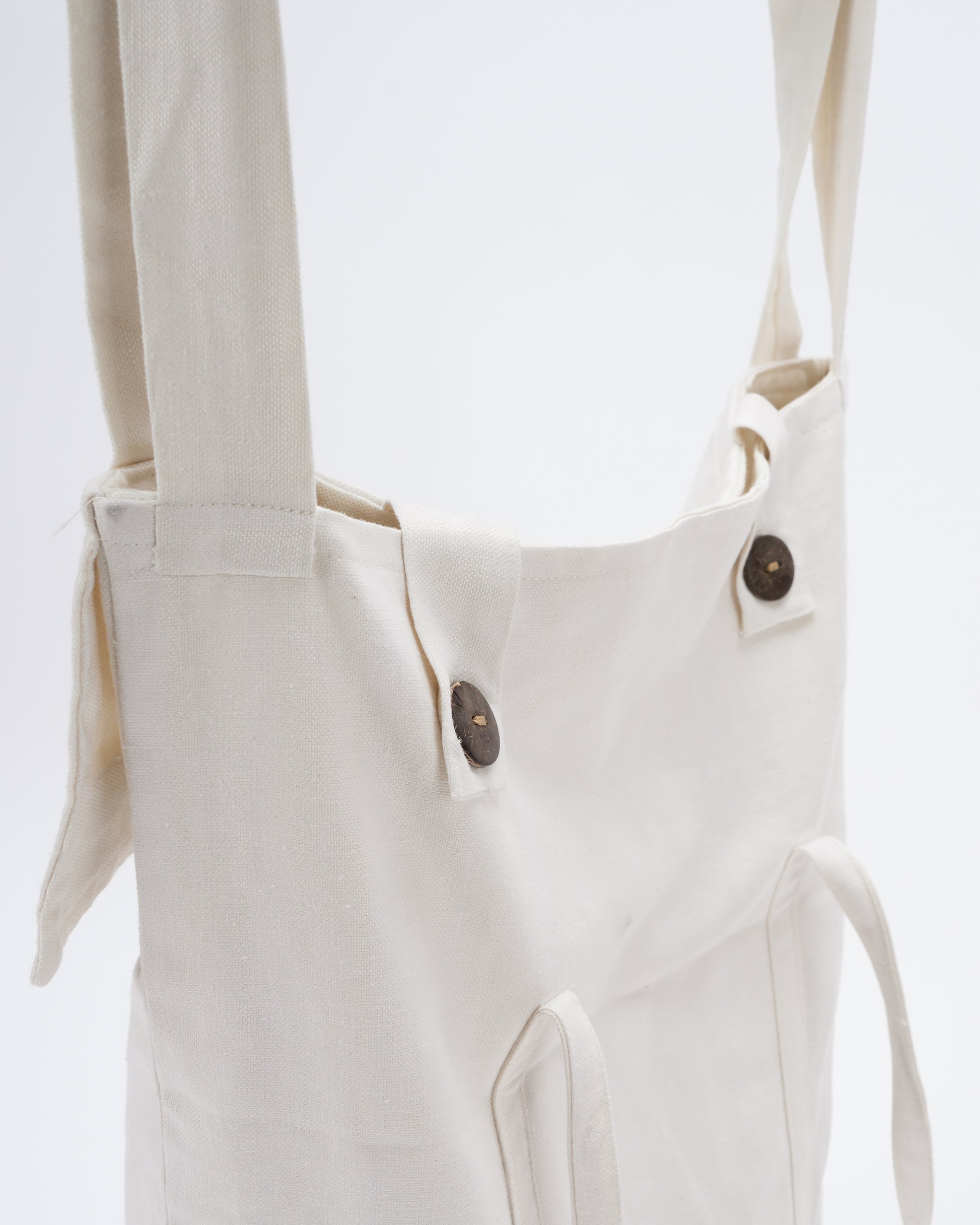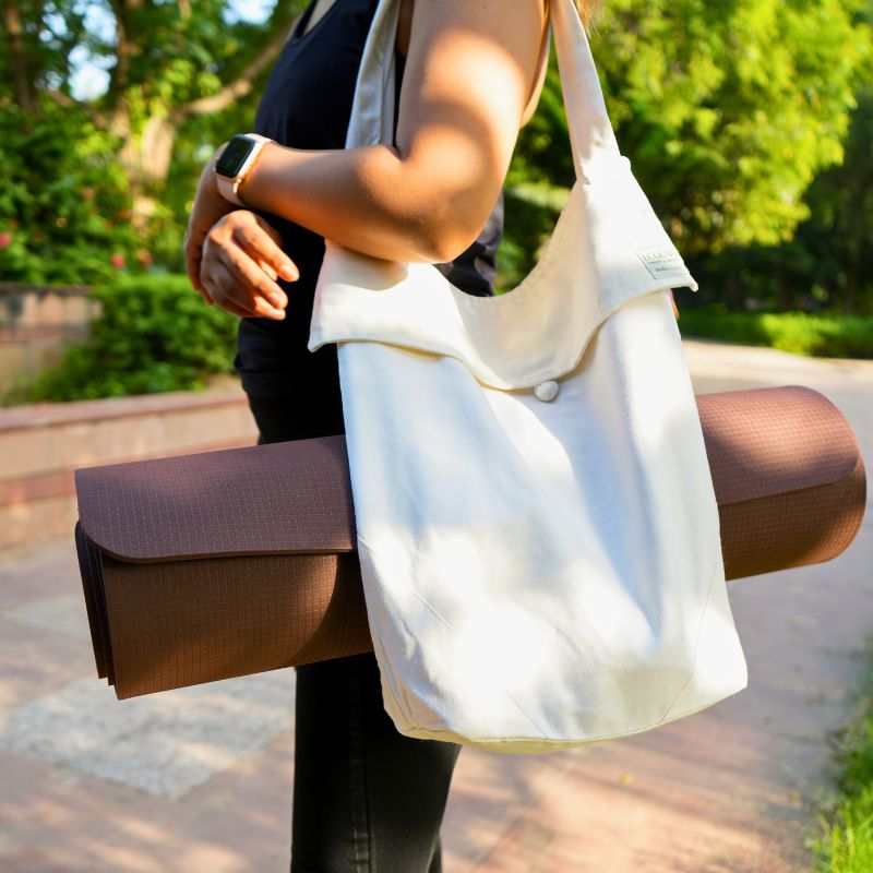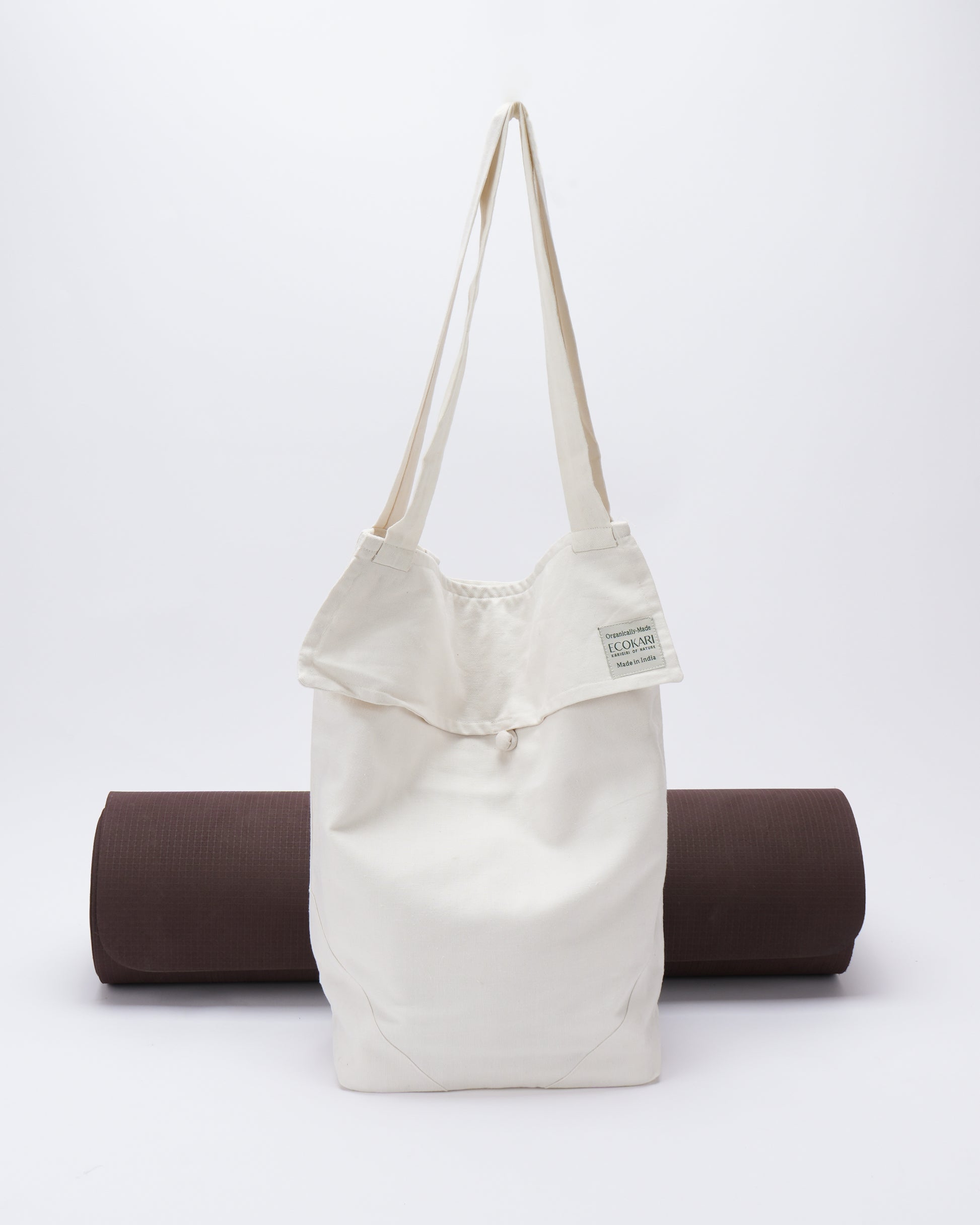 The flap-style design and wooden buttons add a touch of elegance, allowing you to showcase your dedication to eco-living. With its roomy interior and dedicated yoga mat holder, this bag has more than enough space to accommodate all your essential yoga gear. Stay organized and make a statement with our Eco Bag by EcoKari.